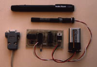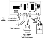 Now you are ready to start attaching the external components. These include the laser pointer, photo-transistor, battery connector, switch and the DB-9 connector. I will leave it up to you as to how you want to house the project, but I suggest that you use a zippy box so that you can mount the photo-transistor and switch. To mount the photo-transistor, you can simply drill a snug hole in the side of the zippy box and use that to secure the photo- transistor. Alternatively a block of plastic or wood, with a hole drilled in it for the photo- transistor, can be attached to the top of the zippy box. The advantage of the block is that it shields the photo-transistor from ambient light. Take particular care with the orientation of the photo-transistor when clipping the pins and soldering wires to it.