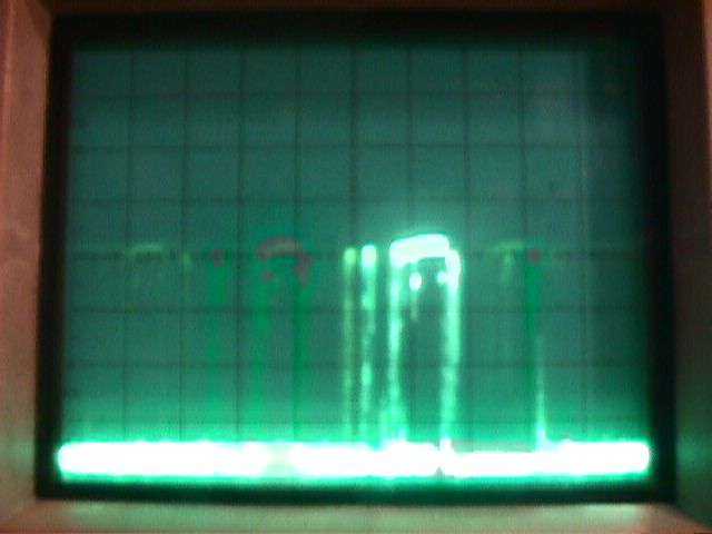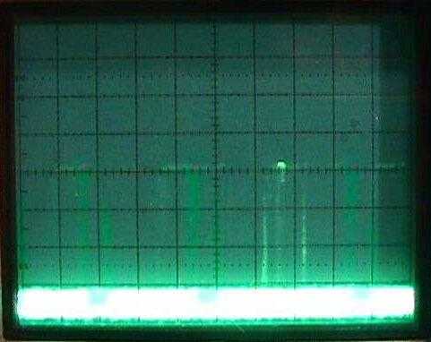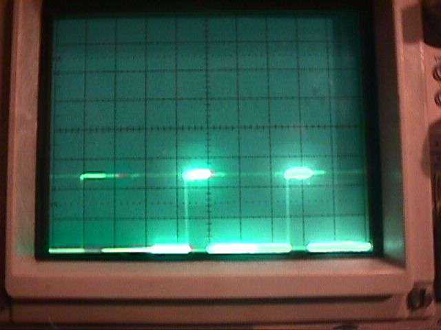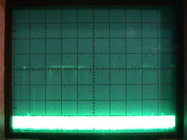 RSSI line - The solid line on the bottom is at 0.6 VDC, which corresponds to a -80 dBm received signal level for the LMX2240 IF receiver. The peaks are syncronized to the frequency hopping and are at around 1.6 VDC, which corresponds to a -20 dBm received signal level.
