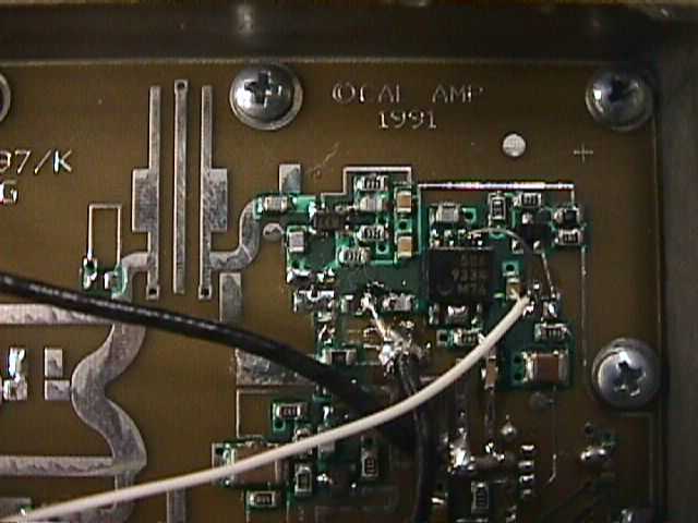 Picture of the prescaler wiring. The white wire is the +5 VDC power line, the coax connection to the left of the IC is the RF input and the bottom coax connection is the divided by 64 RF output. Prescaler is a Fijitsu MB506, refer to datasheet for more information.