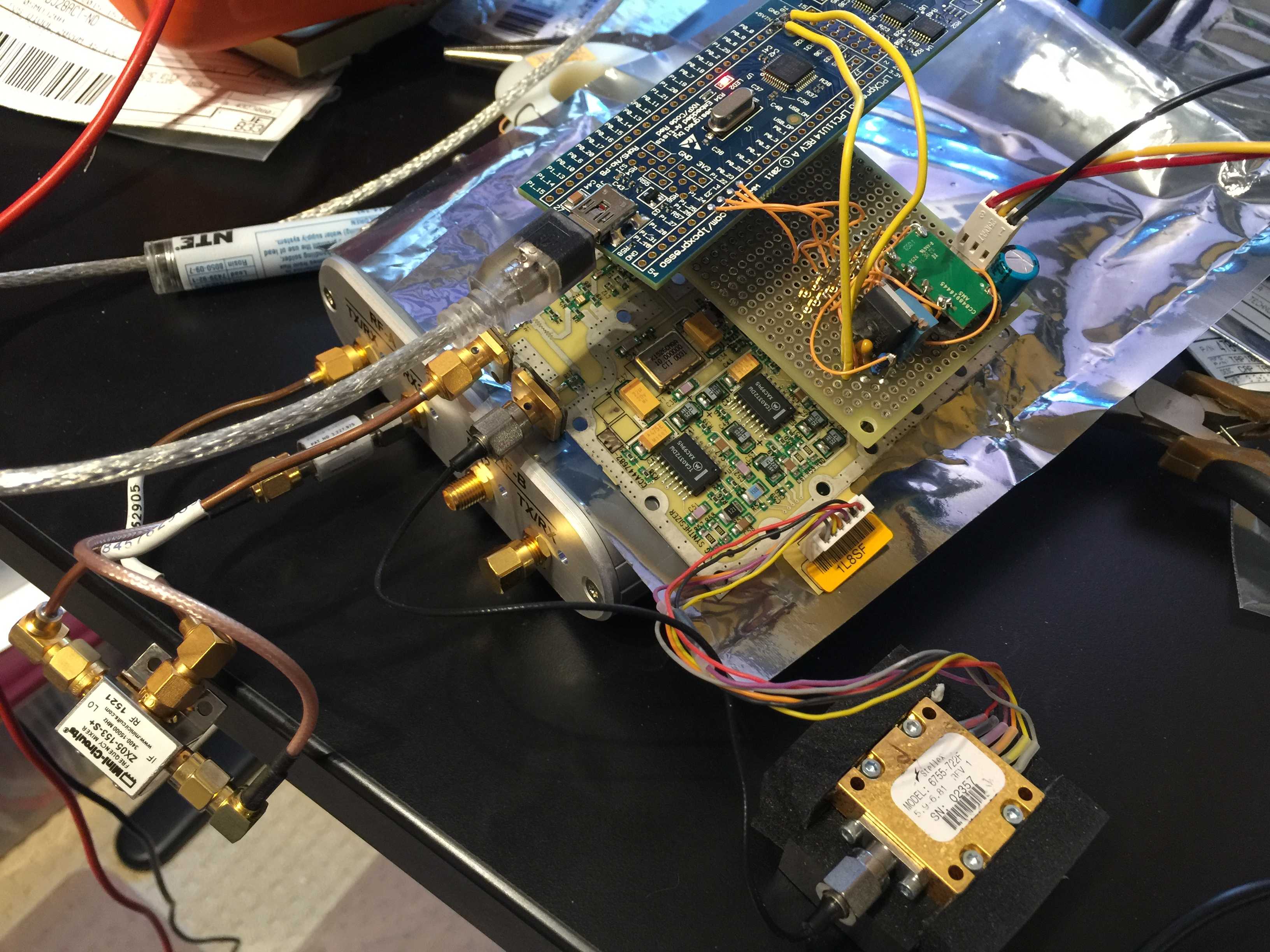 Here's the hardware setup. OMG, sorry for such a cluttered photo. The blue circuit board is the NXP LPCXpresso LPC11U14 evaluation board. The perf board PCB in the middle contains a "POL regulator" APXW003A0X3-SRZ I got from Digi-Key adjusted to 8.5V and a 5V LDO and some caps. The yellow circuit board beneath the perf board is a Stellex synthesizer board from eBay. I did not need to make any modifications to the Stellex synthesizer, but I expect I will do the mod to route in an external 10 MHz reference from a Rubidium oscillator since tests have shown the output frequency is a few 100 kH off. The silver box on the bottom is the Ettus B210 SDR board in a box. The gold cube at the bottom right is a Stellex YIG oscillator from eBay, this one is labeled to cover 5.9-6.81 GHz. The plumbers' delight in the lower left of the frame is the Mini-Circuits ZX05-153-S+ mixer. The mixer's LO port is connected to the Stellex synth, and the RF port is connected to the B210 TX/RF output A, and the IF port is connected to the B210 RX2 port A through a 20 dB attenuator. The synthesizer and LPC11U14 board take about 0.44 A input to the power supply board when running from 12V and the YIG cube gets pretty warm.