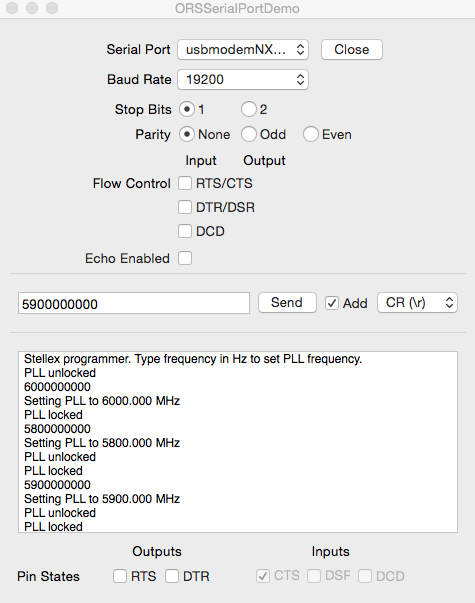 Setting the synthesizer frequency using ORSSerialPort, a Mac serial toolkit